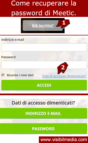Non terminano qui i consigli, perché il resto del post continua con tanti altri suggerimenti importanti per l'utente interessato a conoscere meglio il servizio per fidanzarsi o sposarsi grazie ai social su internet. Consiglio 1: Quando sei sul menu, vai su connessione e identificazione, poi su ho perso le credenziali di accesso account, compresa l'email. Home page con dati di accesso dimenticatiSu Meetic home page dovrebbe essere visibile un collegamento utile per l'utente già iscritto e nella pagina che si apre si può scoprire facilmente il pulsante che segnala i dati di accesso dimenticati nel momento in cui non riesco a ricordare più le informazioni richieste per il riconoscimento e la conferma dell'autenticazione. ![]() Come riavere le informazioni accountEcco come faccio a recuperare la password di Meetic che ho perso o dimenticato e, come puoi vedere nell'immagine della spiegazione inclusa nella recensione, è possibile scegliere uno dei due metodi che aiutano a riavere le informazioni dell'account smarrito che non si usa più da diverso tempo.